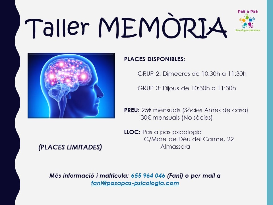 Seguim amb els tallers de Memòria. Ens queden molt poques places disponibles en els grups de dimecres i dijous. No us quedeu sense la vostra!